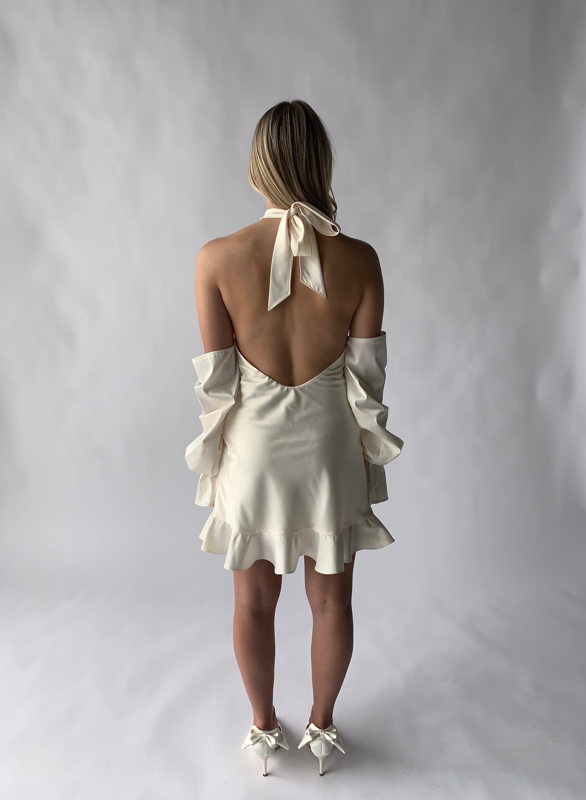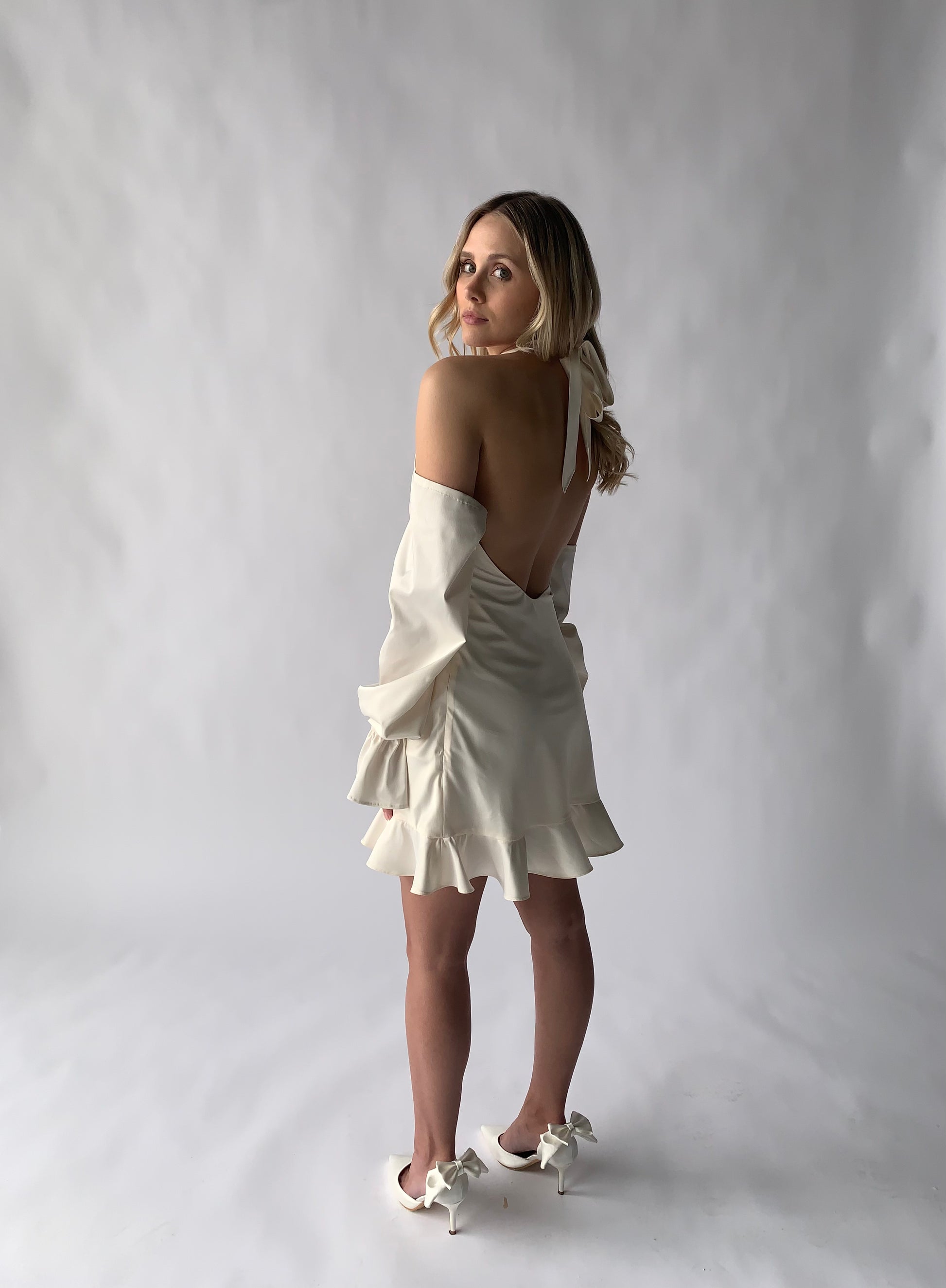 bias-cut halter mini dress in charmeuse with off shoulder gathered sleeves