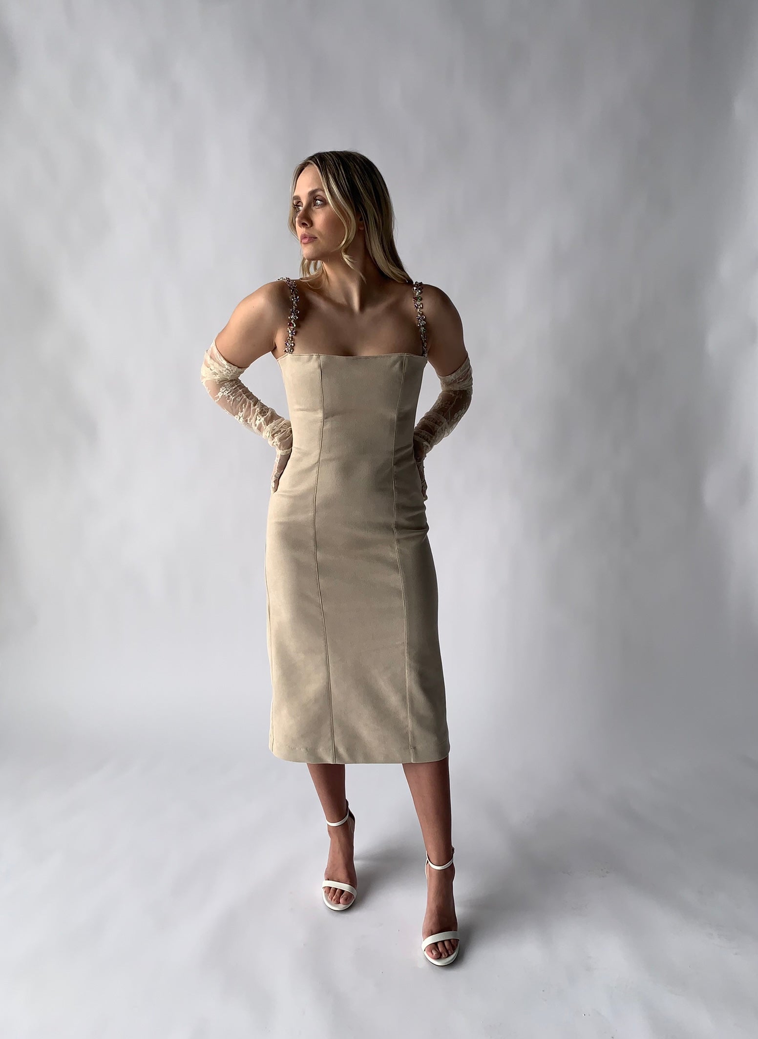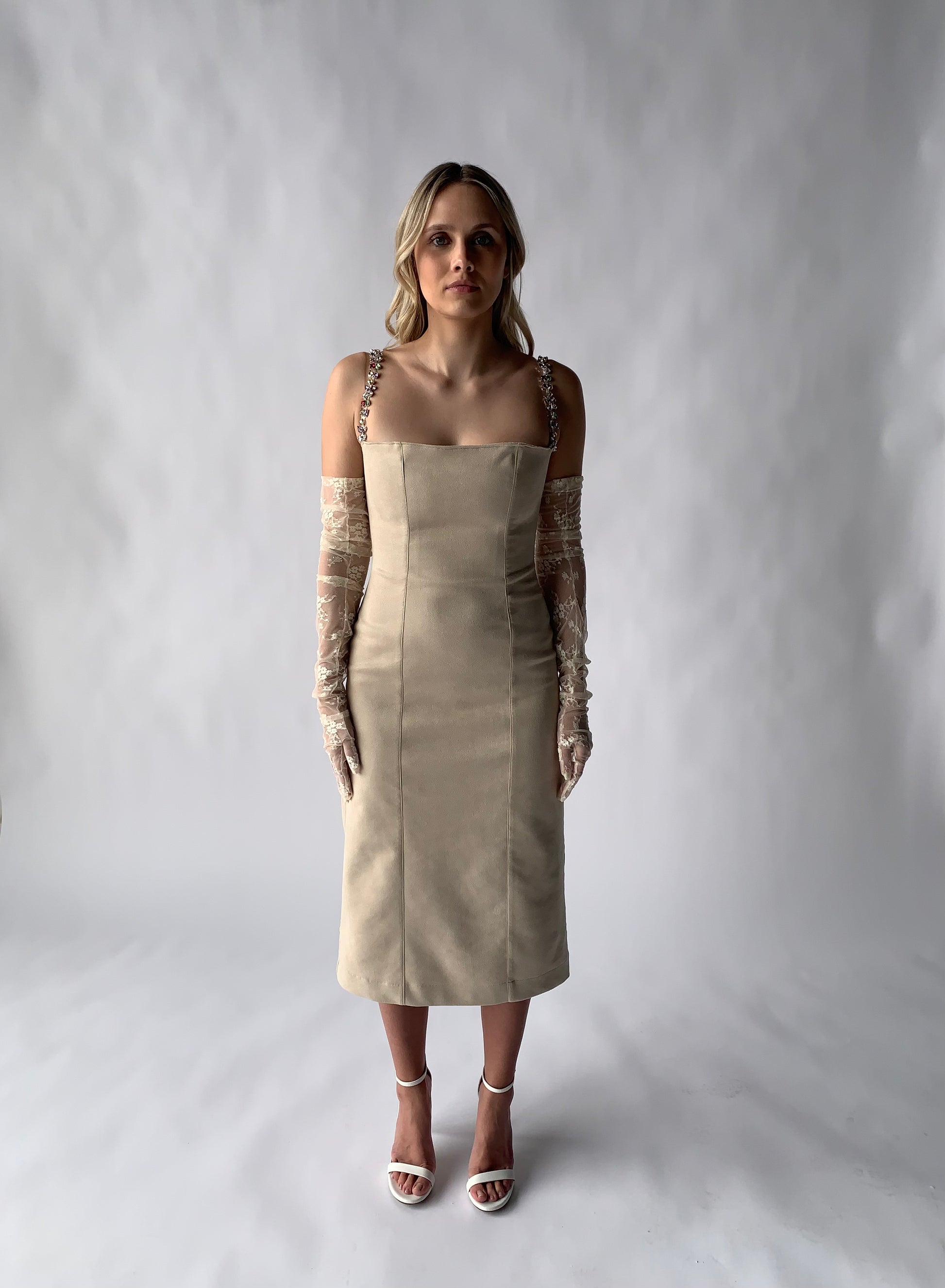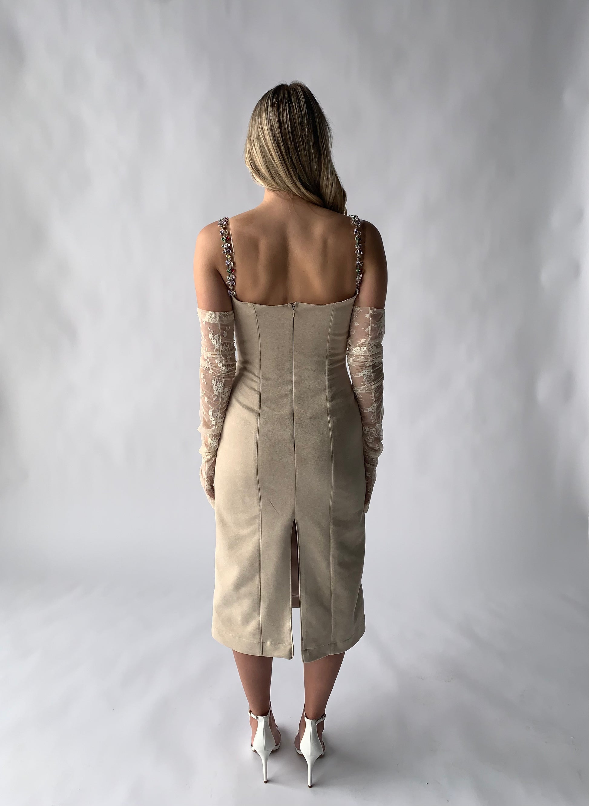 suede midi dress with crystal straps in ivory