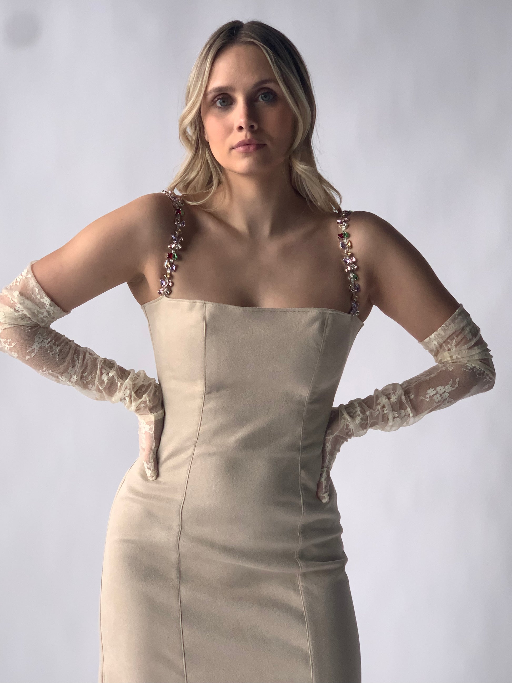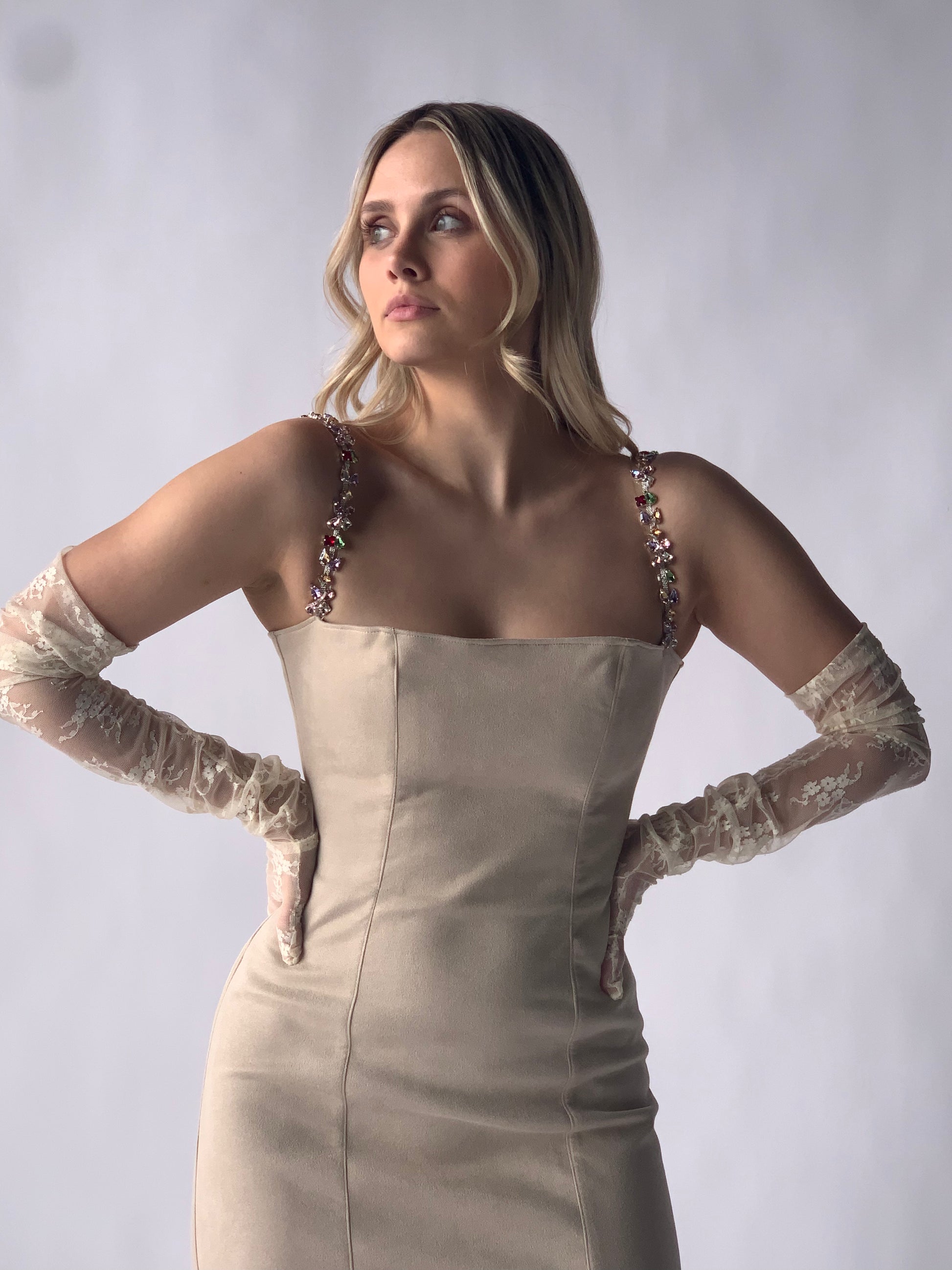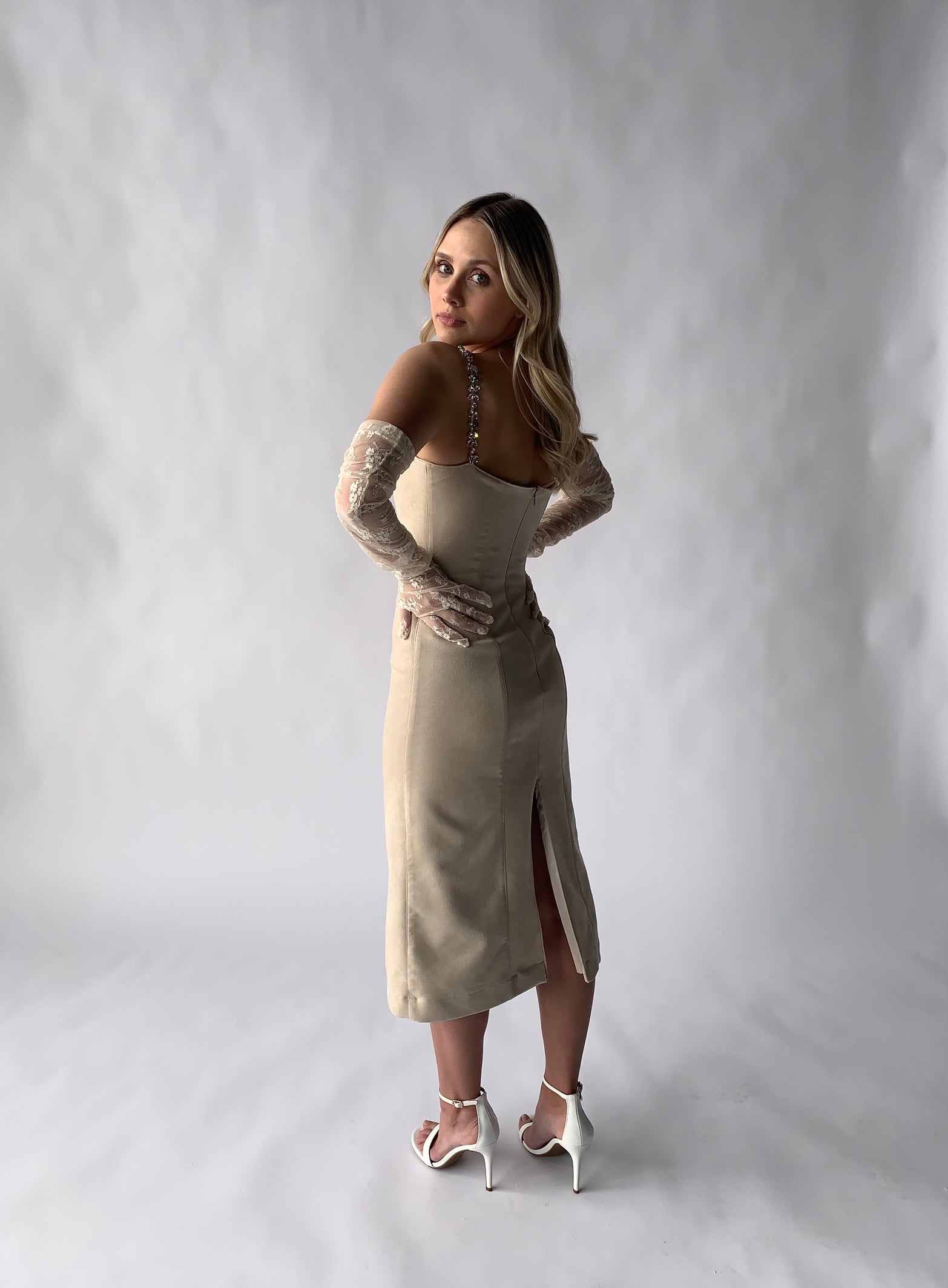 suede midi dress with crystal straps in ivory